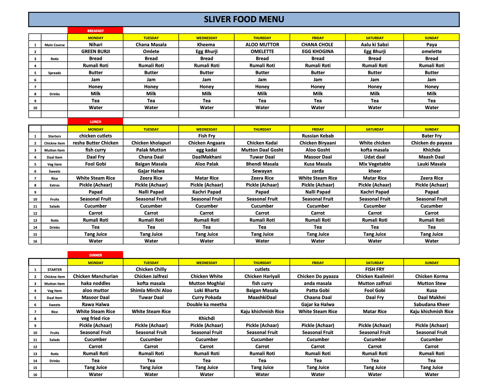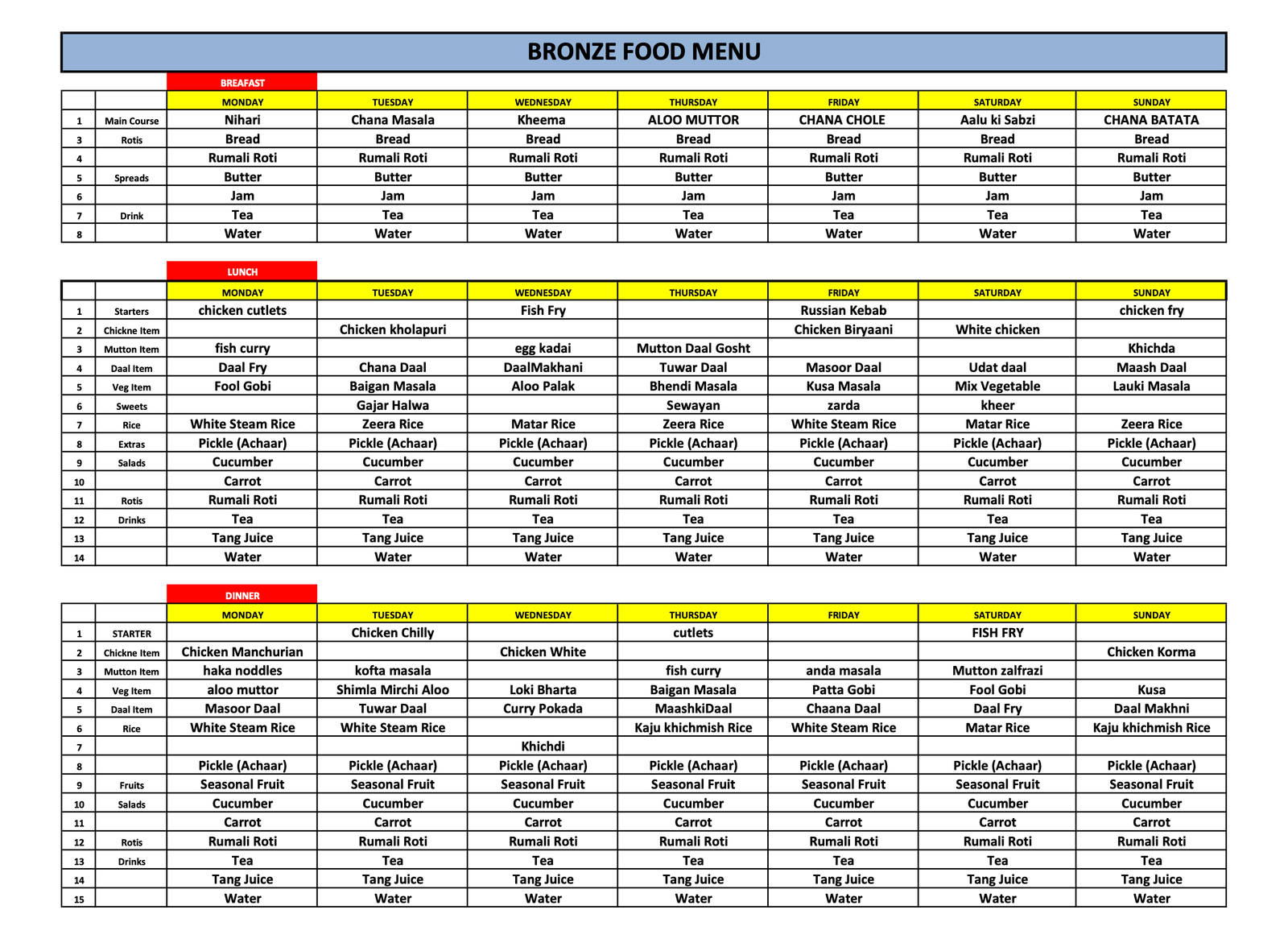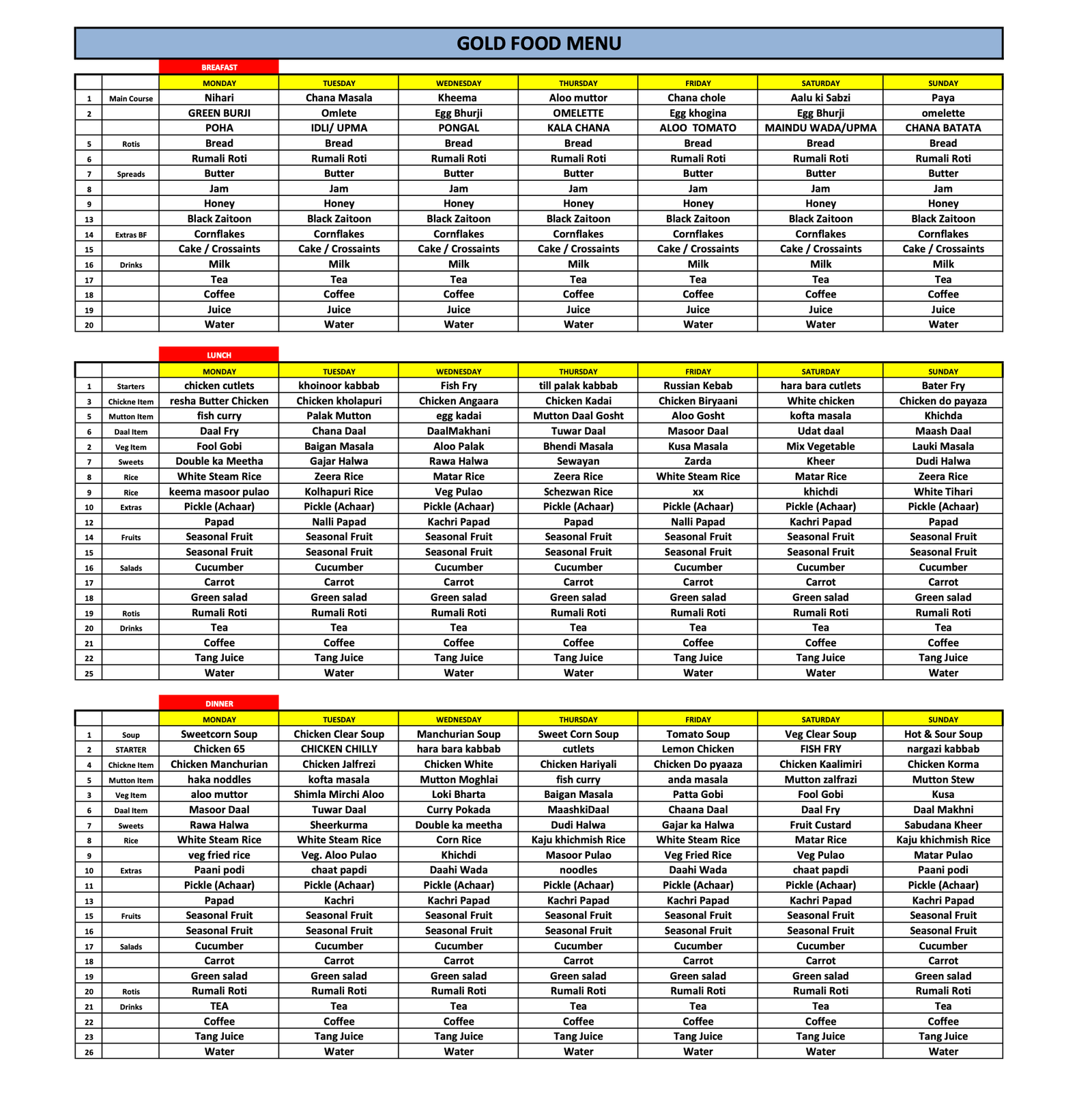• Three daily buffet meals (Breakfast, Lunch, Dinner).